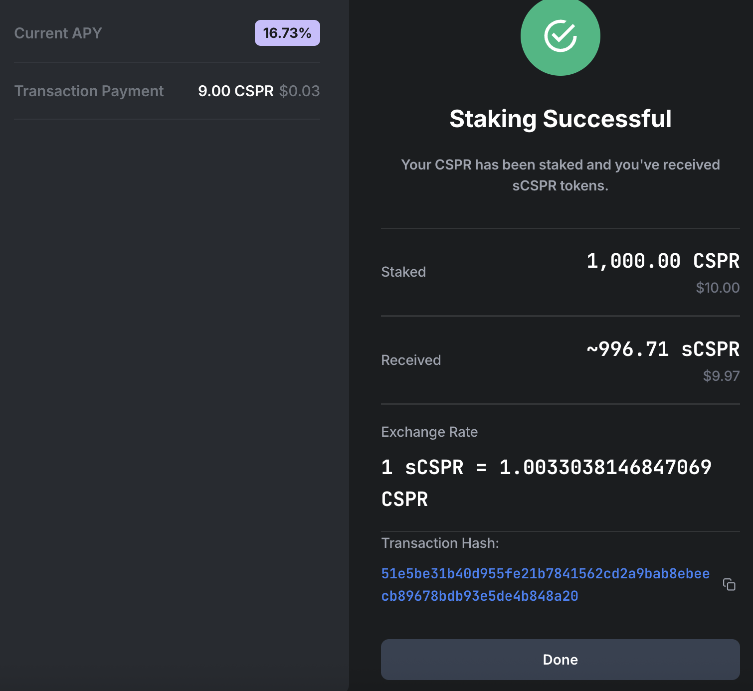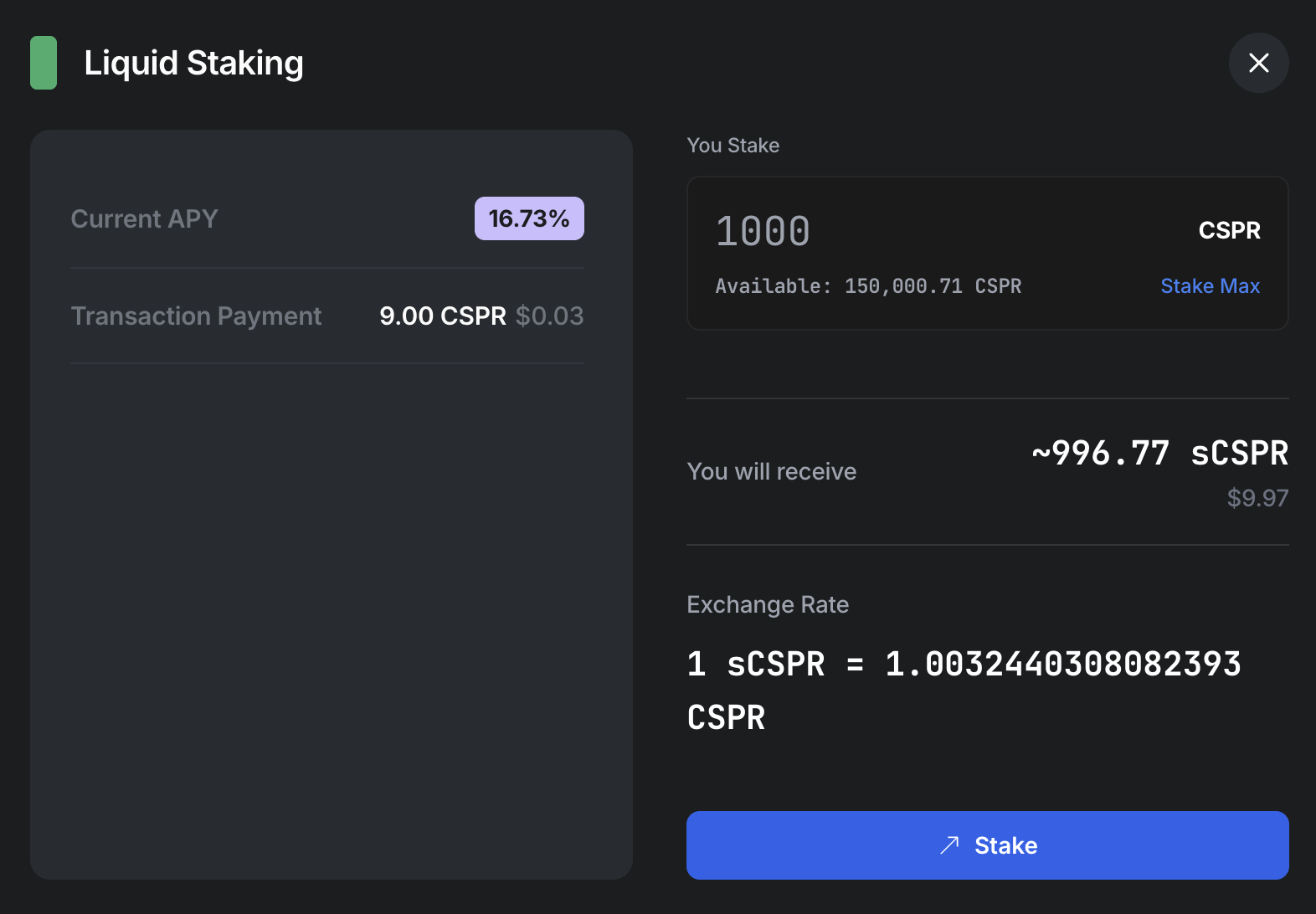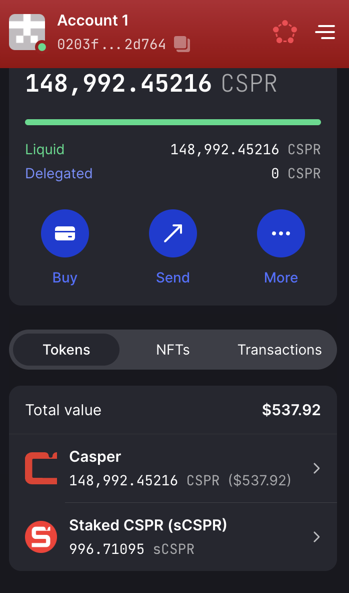 You now have sCSPR! Your sCSPR is displayed in the Casper Wallet UI as well as the “sCSPR Balance” section of the liquid staking platform.