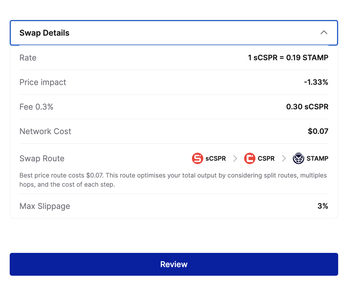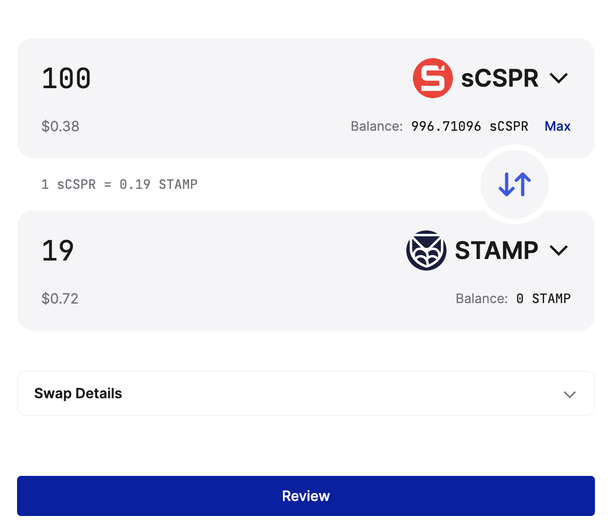 Now that you’ve minted sCSPR by staking your CSPR, your CSPR has begun earning staking rewards, and it’s time to put your sCSPR to use. While the possibilities for sCSPR will continue to expand as Casper’s DeFi landscape evolves, you can already use sCSPR for swaps on CSPR.trade, Casper’s native decentralized exchange.