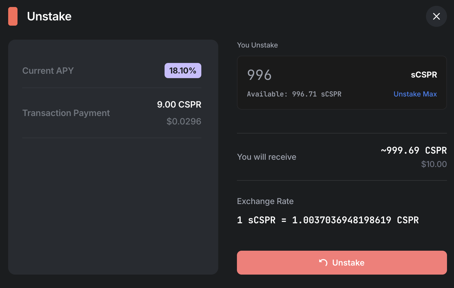 Unstaking converts your sCSPR back into CSPR. You need to wait for 7-eras (~16 hours) period applies when unstaking sCSPR tokens.